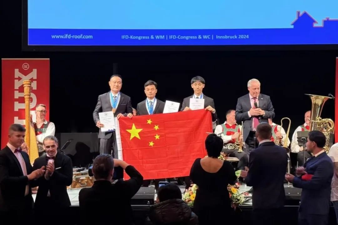 当地时间2024年11月15日,第二十九届IFD世界青年屋面工冠军赛在奥地利因斯布鲁克圆满落幕,各项赛事成绩在颁奖典礼上正式揭晓。由教练张广辉,选手黄佳鑫、吴文全所组成的东方雨虹平屋面代表队作为本次大赛参与该赛项的中国唯一代表队荣获季军及"Special prize by the president"主席特别奖。这一历史性突破,不仅填补了我国在该赛事奖项的空白,更以实战成果彰显出工作室在产业人才培育方面的实效实绩。
