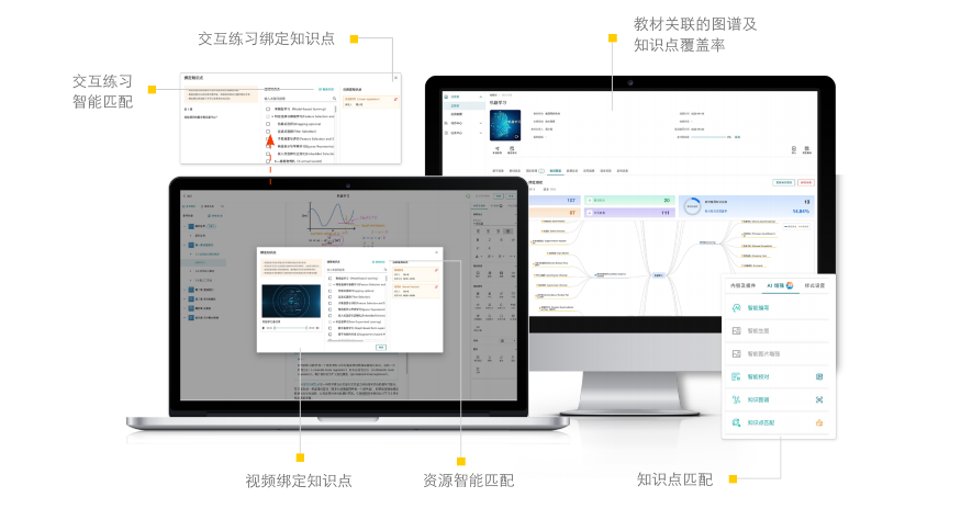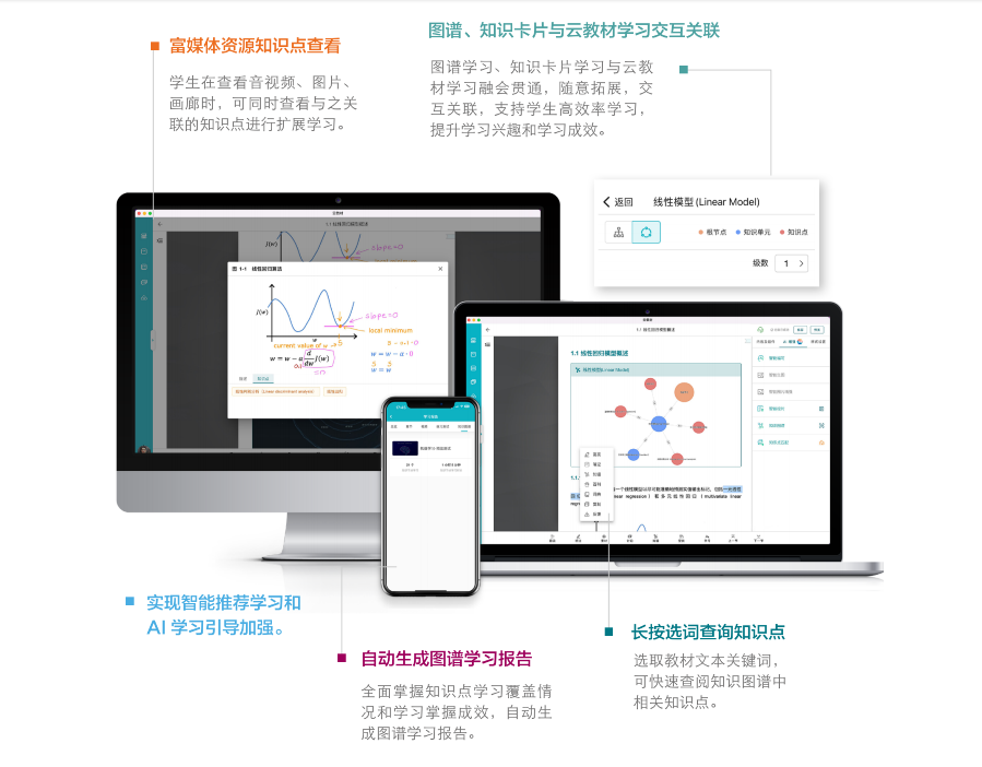学生在学习终端使用云教材学习时,可以随时扩展至知识图谱进行深入学习。同时,系统记录阅读时长、笔记标注、讨论互动、学习进度、拓展学习、交互练习等数据,分析测试正确率和知识点掌握度,为学生提供精准的个性化学习反馈。