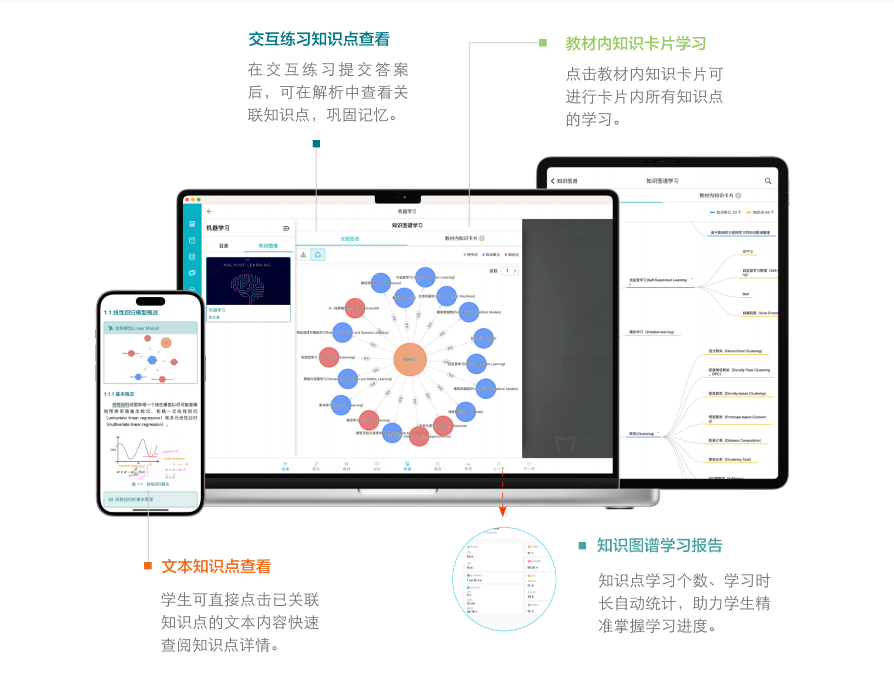 基于知识图谱新型数字教材,支持在教材中插入完整的知识图谱、知识单元及知识点卡片,使学生可以开展基于知识图谱的智能化学习。该系统提供知识卡片学习、图谱学习和智能推荐学习三种模式:学生可通过章节知识卡片整合碎片化知识,点击教材内知识点标注文本快速查阅详情,或在交互练习解析中溯源关联知识点强化记忆;知识图谱可视化界面支持全局知识导航与个性化学习路径规划;学习进度与知识点掌握情况通过自动统计学习时长、已掌握节点数量及完成路径比例生成可视化报告,助力学生精准定位薄弱环节,实现系统性知识建构与自适应学习优化。