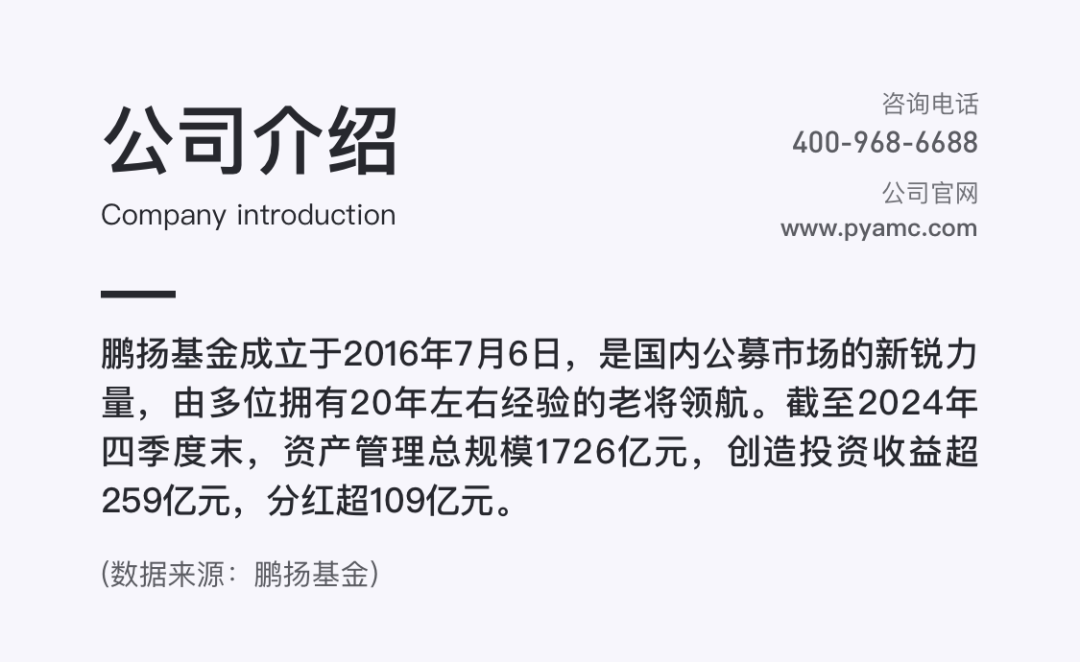风险提示:鹏扬基金总规模、公募基金规模相关数据来源于鹏扬基金,统计截至2024年12月31日。本微信内容是基于本公司认为可靠的且目前已公开的信息,但本公司不保证该等信息的准确性和完整性。在任何情况下,文中的信息或所表述的意见并不构成对任何人的投资建议。本文涉及行业仅供参考,任何投资建议或承诺,也不代表本公司未来长期必然的配置方向。基金投资有风险,入市需谨慎。