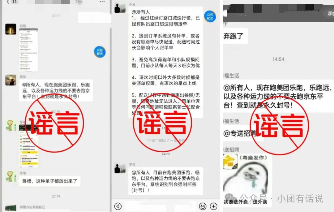 实际上,在相关聊天截图流传出来后,小团第一时间与公司相关部门的同事核实,发现该截图中一名谣言传播者,是安徽省合肥市蜀山区外卖骑手曹某。曹某自述是从其他群里看到“乐跑、乐跑远骑手私自跑某平台,美团会永久封号处理”的谣言,觉得好玩,就在乐跑骑手群内转发。按照《网约配送员协议》及骑手App中的秩序保障规则,编造、散播虚假信息或误导性信息,影响公共秩序,均属违规行为,平台已与其沟通澄清,并依照协议进行处理。