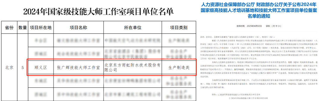 近日, 人力资源社会保障部办公厅、财政部办公厅发布《关于公布2024年国家级高技能人才培训基地和技能大师工作室项目单位备案名单的通知》,东方雨虹张广辉技能大师工作室成功入选2024年国家级技能大师工作室项目单位名单。