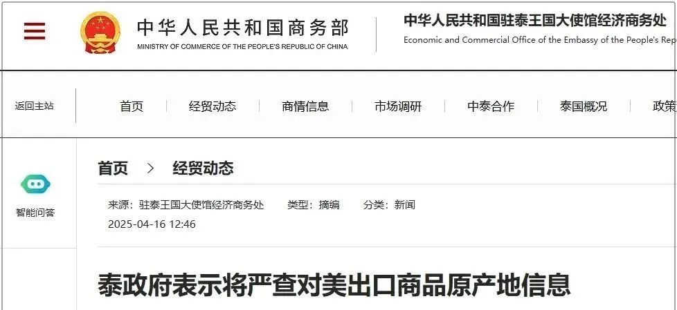 目的是筛查出口商品,防止其他国家借道泰国来规避美国关税。