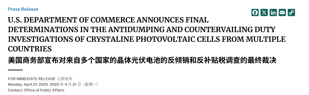当地时间4月21日,美国商务部发布最新公告:宣布对包括柬埔寨、马来西亚、泰国和越南在内的东南亚四国晶体光伏电池(无论是否组装成组件)加征反倾销与反补贴税。