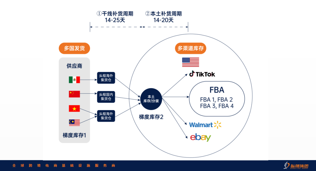 6、海外仓供应链逻辑变迁:重视区域化梯度库存体系 ,从货源地各国口岸要形成一级梯度库存,到美国本土集货分销,形成第二级梯度库存。最后是分流到不同区域FBA和其他第三方仓,完成第三级梯度库存。实现 C+N To 区域化市场的库存体系。
