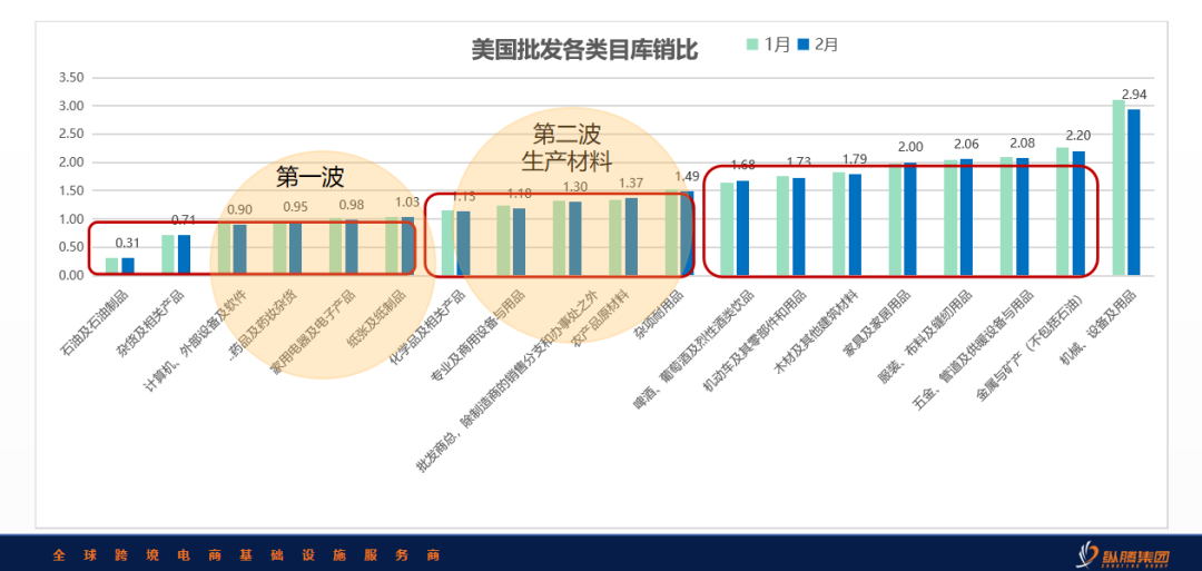 第二波化学品、专业商业设备、农产品等生产原料库存维持在1.1–1.5月,因为中国这部分占比不是压倒性的,所以会出现部分类目库存紧张局面。