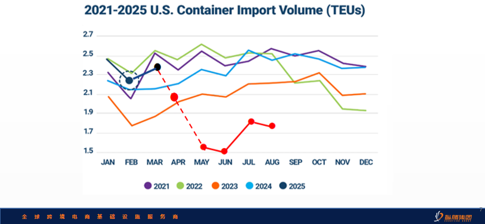 NRF(4月9日)预测2025年下半年美国进口货运量将下跌20%,全年降幅或达15%。连续19个月的增长或将在5月终结,7月、8月同比跌幅预计高达27%。