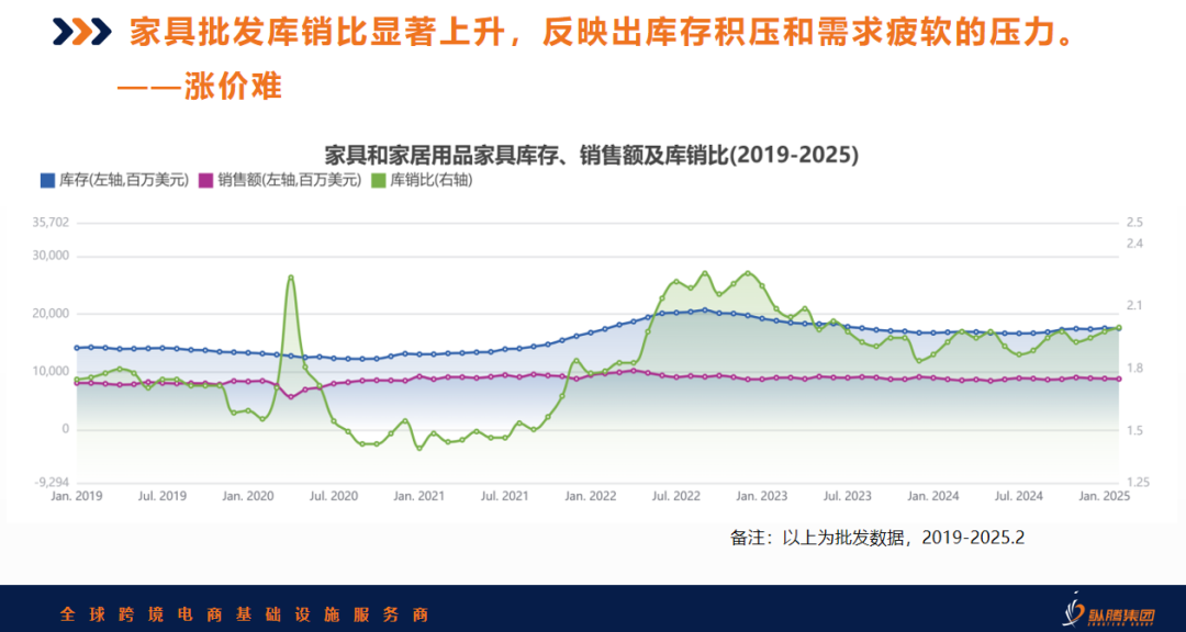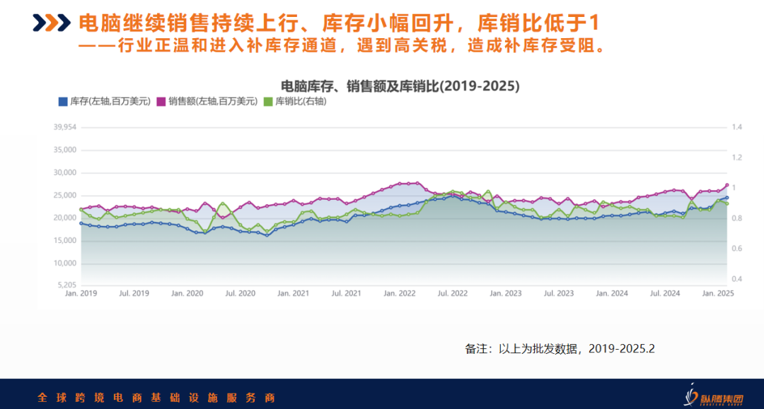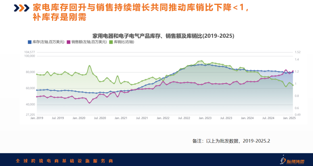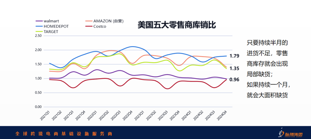 虽然美国零售商与中国卖家一样,都在提早备货应对潜在关税政策变化。他们在1–2月进口额已经超过4000亿美元,比往常水平足足多进口了1000亿美元,但预计仅有助于提高3月库销比上升0.1-0.2。