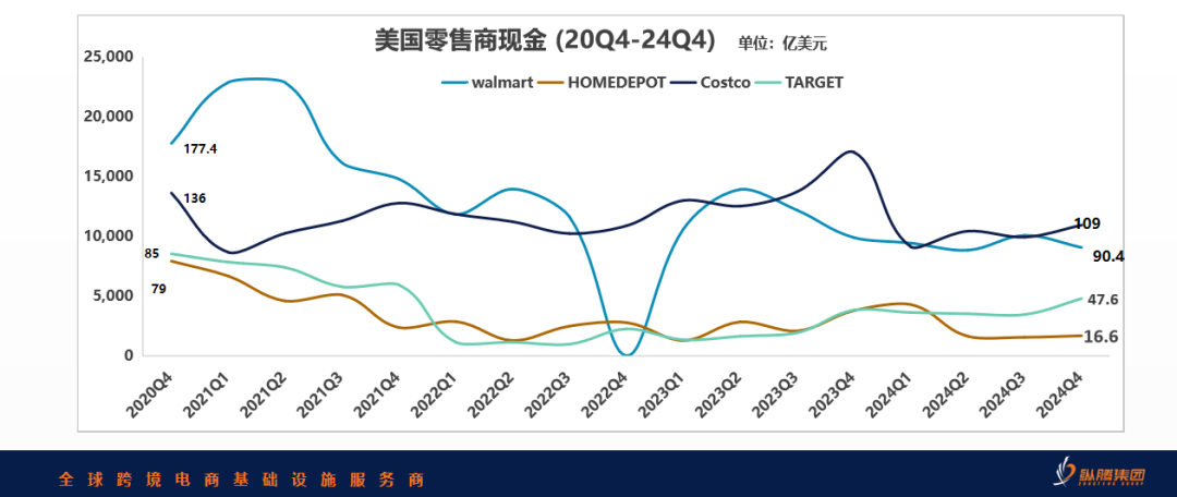 亚马逊科技零售平台2024一整年都在大规模储备现金,Q4达到创纪录的近800亿美元。但亚马逊似乎并没打算现在用现金增加库存,甚至放弃了部分自营采购的高关税货物。而沃尔玛、Costco、家得宝等传统零售商由于高利率,纷纷资金去杠杆,降低银行贷款。手持现金4年内下滑30–80%,没有多余资金支付高额关税。“高成本 vs 空货架”正在撕扯着绝大多数的零售商、进口商、品牌商。