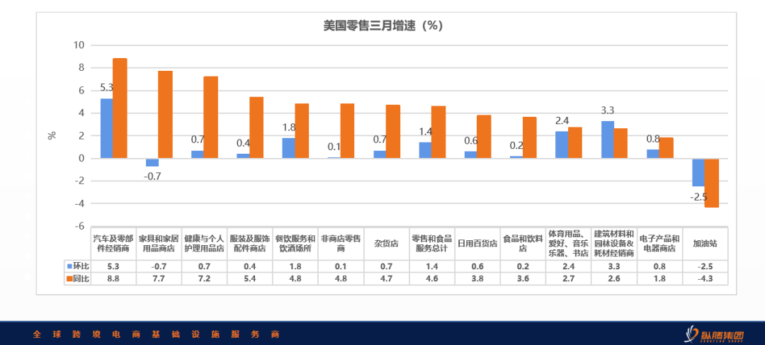 在“没钱、缺货”的双重压力下,零售商还面临零售增长不确定的前景,博弈空间日益收窄。结合3月零售数据来看,美国零售消费显示结构分化:除了汽配、建材、体育品类表现良好;家居、服装,健康护理销售增长乏力,甚至负数。