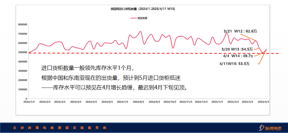 实际情况比这个预测还要严重,就在解放日宣布那周,美国进口集装箱跌至50万TEU,已回落至近两年最低点。同比持续增长预计在4月就提前结束,比预测提早一个月。结合中国与东南亚出货数据判断,美国零售批发库存增速将在4月放缓并见顶。而进口货柜数量领先当地库存水平一个月,那意味着5月美国的库存将迎来首轮缺货拐点。