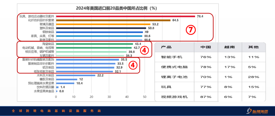 2024年美国前20大类进口商品中,中国商品在美国海运进口商品占比中仍高达38%。其中15个门类占比超过30%。玩具、电子等类目市占率稳居70%以上,中国的供应链从原材料、半成品到成品都不乏处于绝对市场份额垄断地位的企业或细分赛道。在价格、规模、产品丰富度、交付时效能力仍具深厚护城河。