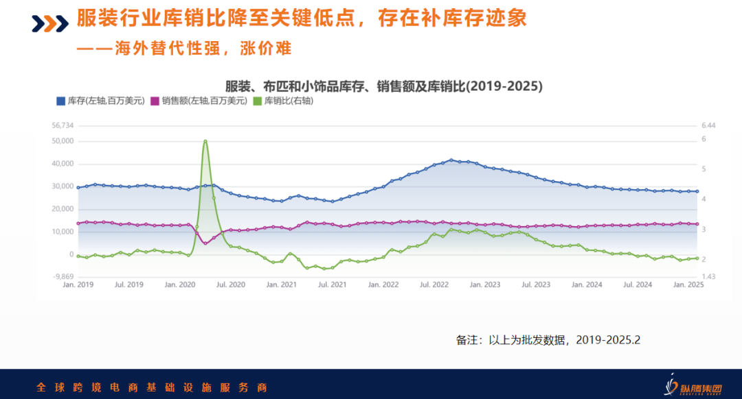 而第三波则是生活消费品处于1.5-2.2之间,也是中国跨境电商密集的领域。其中服装、家居、汽配、五金等跨境电商重点类目库存相对充足(1.5-2),这部分情况比较复杂,虽然由于产地替代性较高加上库存充裕,销售一般,库存涨价空间受限。但是随着时间持续,其中部分类目估计已经在消耗安全库存了。