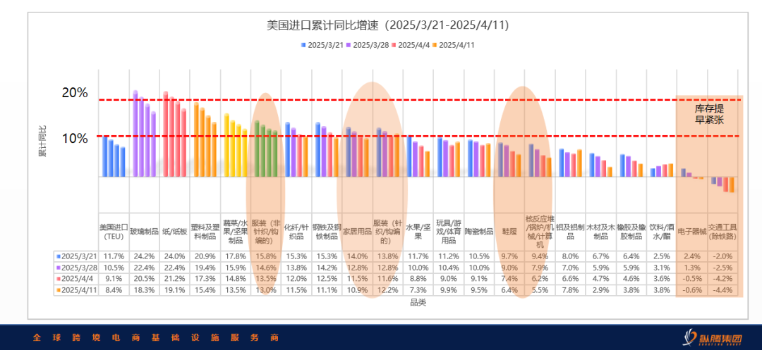 具体到各进口类目,第12周(3/21)起到第15周(4/11),美国主要进口类目累计同比增速开始每周下降1-2个百分点,服装、家居仍维持双位数增长,鞋履、计算机累计同比增长只到5%。电子产品与汽车类目增长近零甚至为负。预示4月中上旬库销比达到顶峰后,将逐步下滑,部分类目将先后出现短缺。类似电器、手机、电脑等这些原本受益于敏捷型供应链,库销比都小于1的品类最先承受压力,所以通过游说争取关税豁免来应对突如其来的供应链熔断。