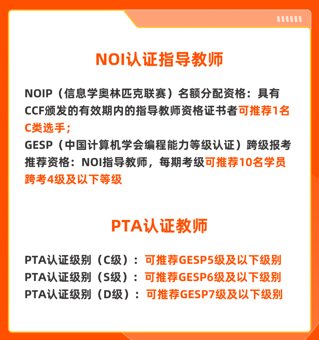其主办编程赛事/认证包括GESP、CSP-J/S、NOIP、NOI等,这些赛事奖项是编程选手认证成为“科技特长生”的重要参考。