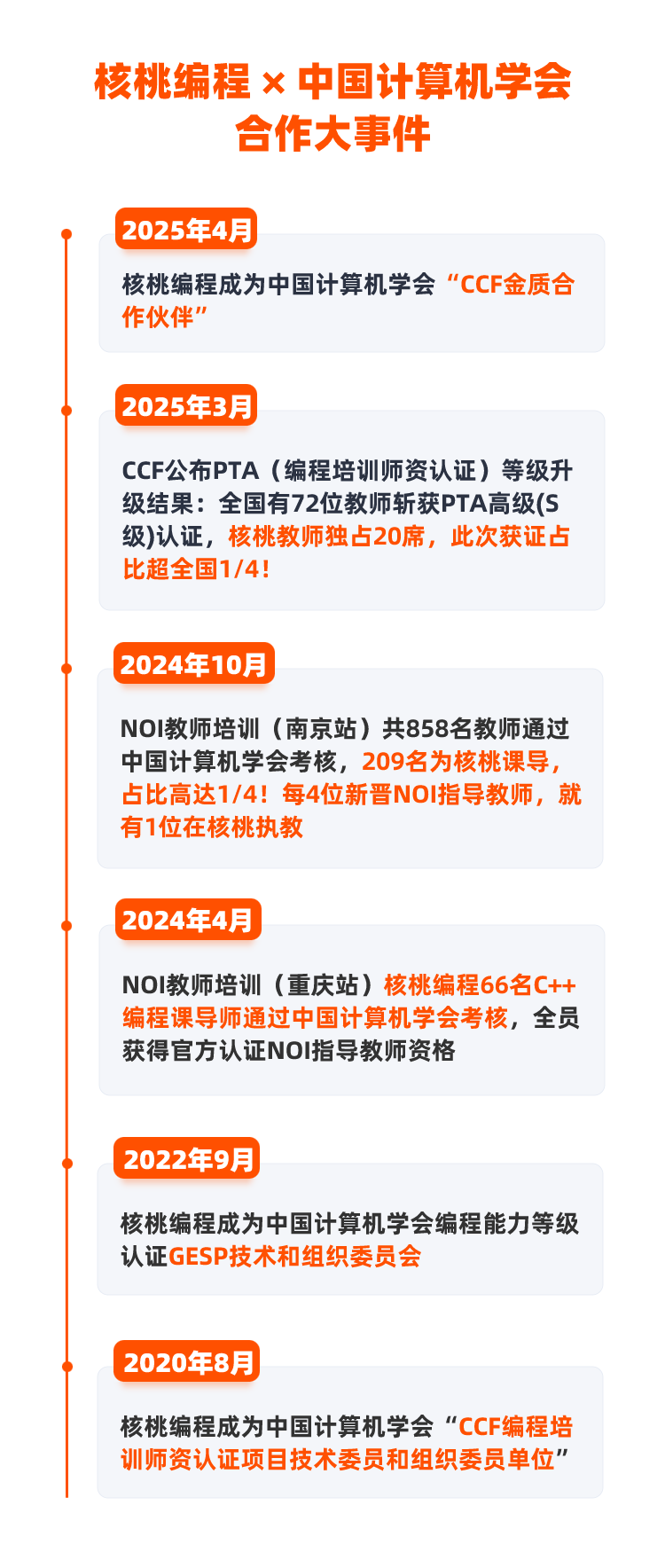 回顾与CCF的合作历程,每一个重要节点都见证了核桃编程的专业深耕与实力进阶: