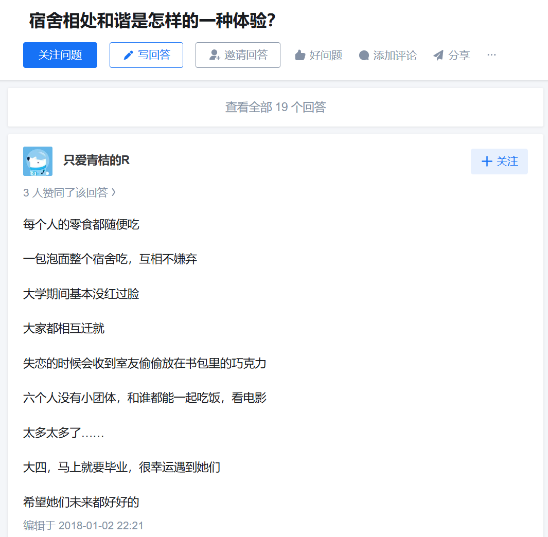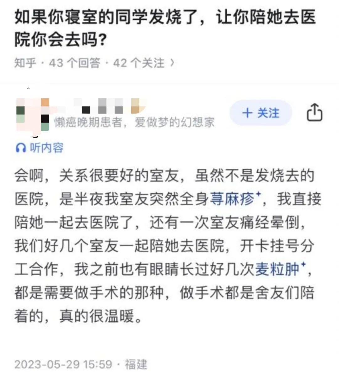 在这一level上的室友,也会是你生病时第一个知道你病情、帮你请假或是送你去医院的人。就如同知乎上一位同学分享的,室友全身荨麻疹,自己会直接陪着去医院;而自己长了麦粒肿需要手术,全程也是关系好的室友在陪伴。