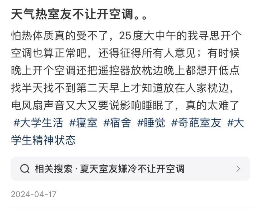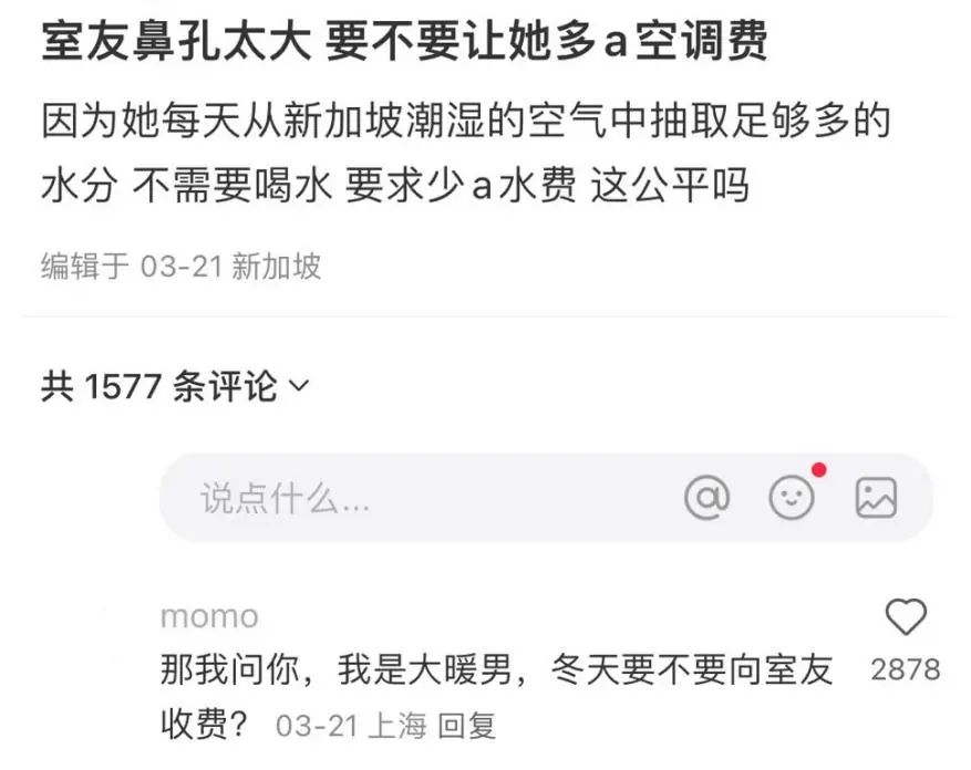 比如最近,有网友在小红书上“诚心发问”:“室友鼻孔太大,要不要让她多A空调费?”