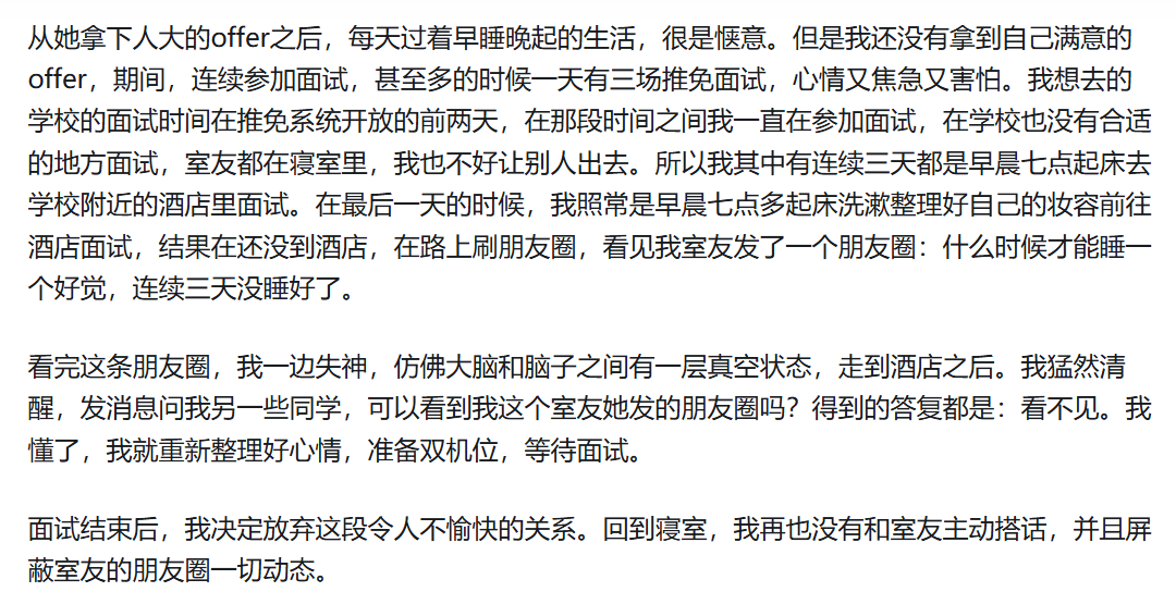 拿保研来说,一个专业的保研名额有限;而诸如“互联网+”大学生创新创业竞赛、“挑战杯”全国大学生系列科技学术竞赛等这些高含金量的比赛,往往又是保研材料的重要部分。室友间就可能因为参加了同一比赛而变成竞争关系。在“卷绩点”、“拼竞赛”的场域中,寝室内的关系变得微妙尴尬,甚至争吵开撕。