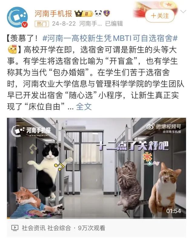 无独有偶,河南农业大学也研发出了一种用mbti、兴趣爱好等分类来选择室友的程序“随心选”。多种维度的评估,打破了学生之间的信息差,也扩展了他们自主选择室友的空间,让新生实现了真正意义上的“选室友自由”。