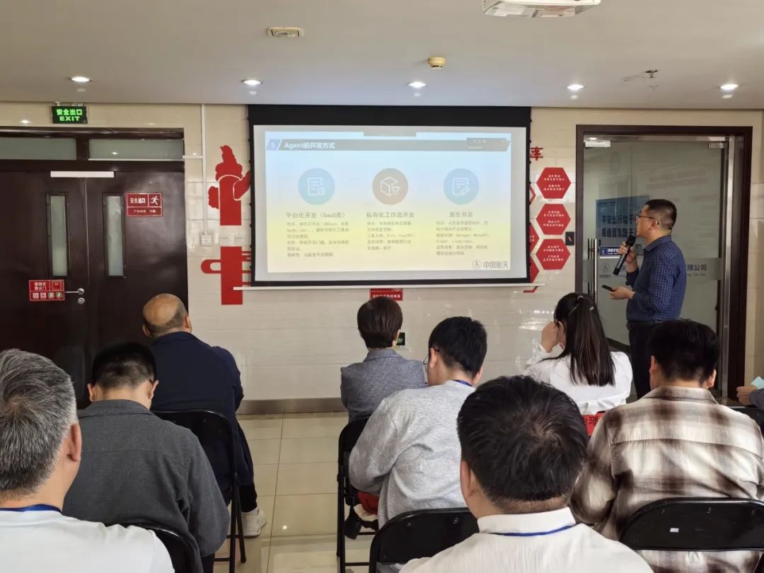 在“AI 创新应用”分享环节中,公司两位技术骨干分别围绕 “AI 大模型初步应用”“智能风险防控与 1+6+N 技术架构” 等主题,进行了深入浅出的讲解。他们结合具体项目案例,详细分析了 AI 技术在提升工作效率、优化业务流程、强化风险管控等方面的实际效果,展现了公司在智能航天领域的初步探索成果。