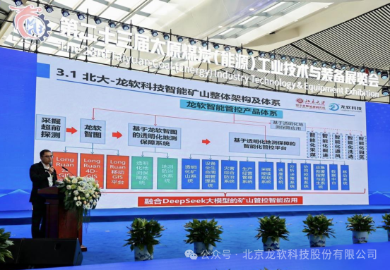 在展会期间,公司副总工程师兼智能矿山安全技术研究院院长景超先生,应邀在煤炭绿色智能开采技术交流活动中作了题为《高级智能化煤矿建设发展战略思考和系统设计》的专题报告。景超院长在报告中深入阐述了龙软科技与北京大学团队在智能化煤矿建设领域的创新成果与实践经验,提出了构建高级智能化矿井的6626工程,并展示了团队在矿山时空大模型、煤矿装备智能化、地质测量透明化、数据分析在线化、智能系统集成化、控制协同化以及生产过程绿色化等方面取得的卓越成就;并重点介绍了基于人工智能时空大模型的智能决策技术,以及该技术在地质保障系统、智能管控平台、调度决策支持系统等方面的落地应用。