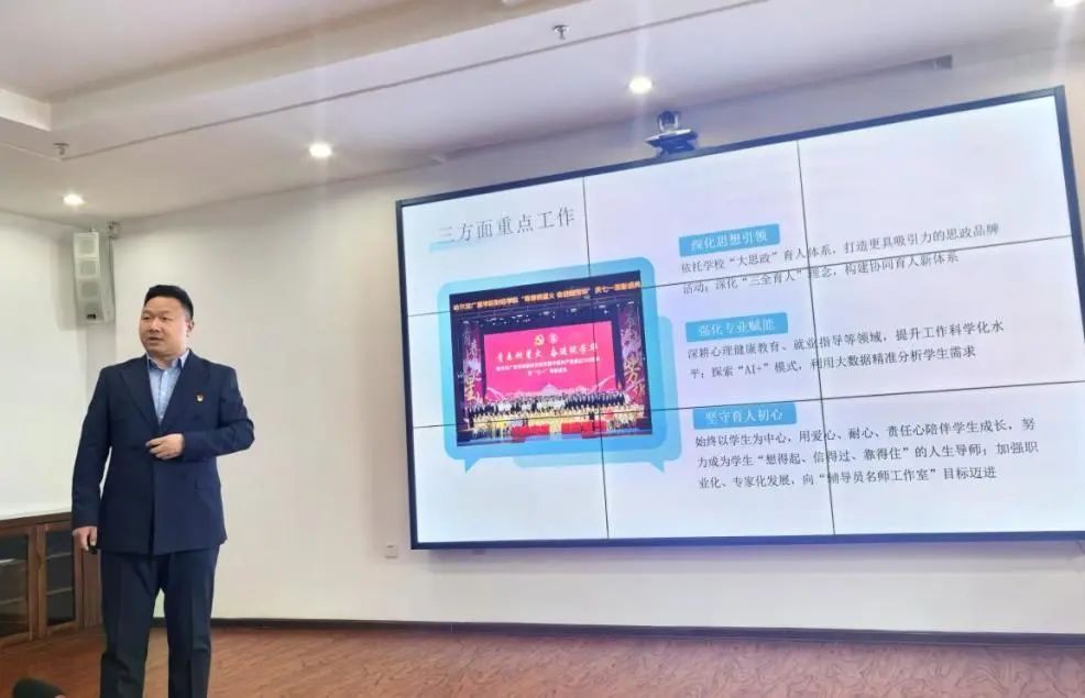 党委书记李忠祥充分肯定了辅导员的述职汇报内容,结合自身经历对国家政策进行解读,并对下步工作提出三点建议。一要加强自身建设,努力成为优秀的辅导员。要遵循“三个一”素质提升工程,获取一本证书(一项技能)、确定一个研究方向、讲好一门课程。二要以辅导员工作室为载体,打造学生工作品牌。品牌建设必须依靠团队协作,学校应整合优势资源,以辅导员工作室建设为抓手,推动学生工作品牌化发展。通过工作室建设培育特色育人品牌,全面提升学生工作质量和社会影响力。三要加强培训,努力使辅导员队伍成为一个专业化专家化的队伍。要建立课程化、体系化的辅导员培训体系,形成贯穿全年的培养计划。只有队伍建强了,我们的工作才能开展得更好。