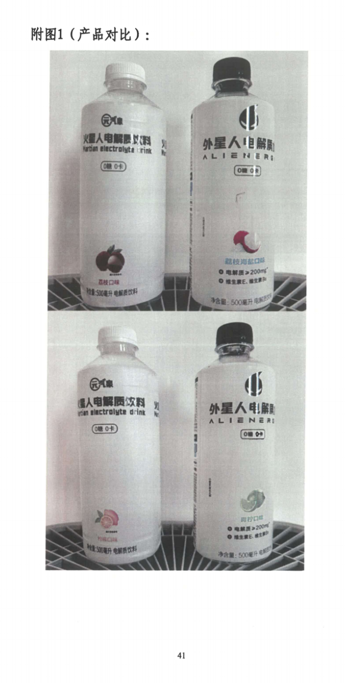 案件二:元气森林起诉江苏某食品公司侵害元气森林“火星人”注册商标专用权及侵害外星人电解质水包装装潢不正当竞争纠纷一案,无锡市中级人民法院一审审理认定被告在其生产和销售的“火星人电解质饮料”产品上使用的“火星人”标识构成对元气森林享有独占授权的第32类“火星人”商标的侵权(该商标系元气森林的防御商标)。且鉴于其与外星人商标客观上具有一定近似,容易造成消费者的混淆。元气森林提供的证据足以证明外星人电解质水的包装装潢已具备一定的知名度和影响力,而被告生产的侵权产品包装装潢整体视觉效果与外星人电解质水近似,故构成不正当竞争。同时该被告在销售中使用“火星人电解质水全国销量领先”的广告语无事实和依据,构成虚假宣传。最终一审法院判决该被告立即停止侵权行为并赔偿元气森林经济损失200万元。目前本案尚处于二审阶段。