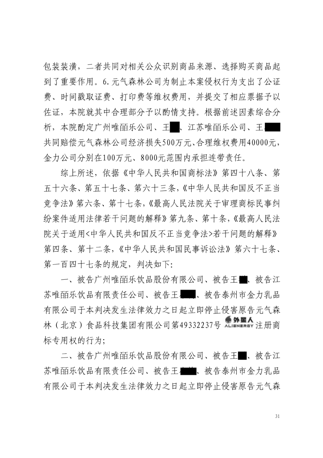 知识产权是元气森林(北京)食品科技集团有限公司(以下简称“元气森林”)重要的无形资产,其凝结着元气森林多年创业所获得的商誉和商业价值。外星人电解质水自2020年上市以来凭借优秀的产品力和元气森林长期、持续的研发投入,现已成为运动饮料品类的头部品牌,亦是元气森林重点保护的品牌。正值全国知识产权宣传周,外星人电解质水近期也在知产维权方面取得了重要成果。其中两个维权案件均获得超百万元赔偿,现对外公布。