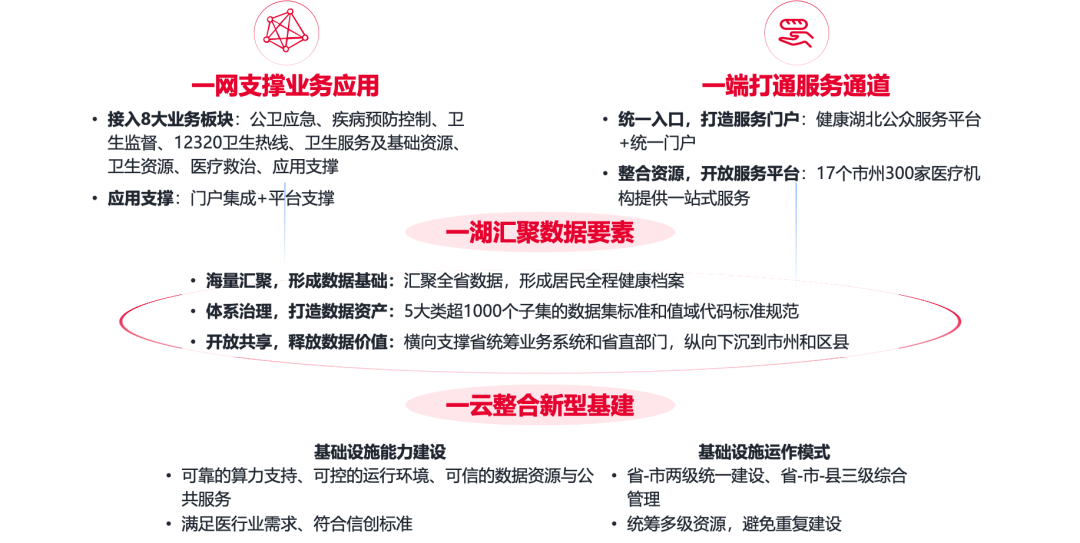金山云助力湖北省卫健委采用云化中台技术,建成全国首个“一云、一湖、四中台、两门户、多应用”架构的省级健康医疗大数据中心。以标准先行开展数据建设,金山云协同专家组发布并落实5大类超1000个子集的数据集标准和值域代码标准规范,实现医疗服务、疾控、中医三大体系数据标准统一;通过湖仓一体与实时处理技术,实现省、市、县平台数据双向流动;构建统一业务服务与协同引擎,推动平台53个业务应用紧密协同;并通过微服务与容器化技术,显著提升系统可维护性与可扩展性,实现降本增效。基于统一数据与技术底座,61项卫健应用运行于平台之上。全省各级卫健委、17个市州近300家医疗机构统一接入“健康湖北”门户,为百姓提供预约挂号、在线问诊、家庭医生、疫苗接种、用要提醒等一站式健康服务。湖北省健康医疗大数据中心已成为全省统筹医疗卫生监管治理、业务协同、便民惠民应用的稳定技术底座 ,有效支撑全省“影响群众健康突出问题323攻坚行动”等项目落地。