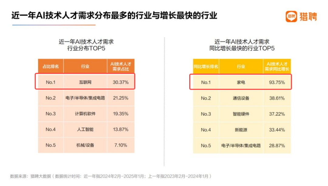 猎聘大数据研究院发布的《2025AI技术人才供需洞察报告》显示,对AI技术人才需求最旺盛的行业为互联网行业,占比30.37%,家电行业对AI人才需求同比增长93.75%。