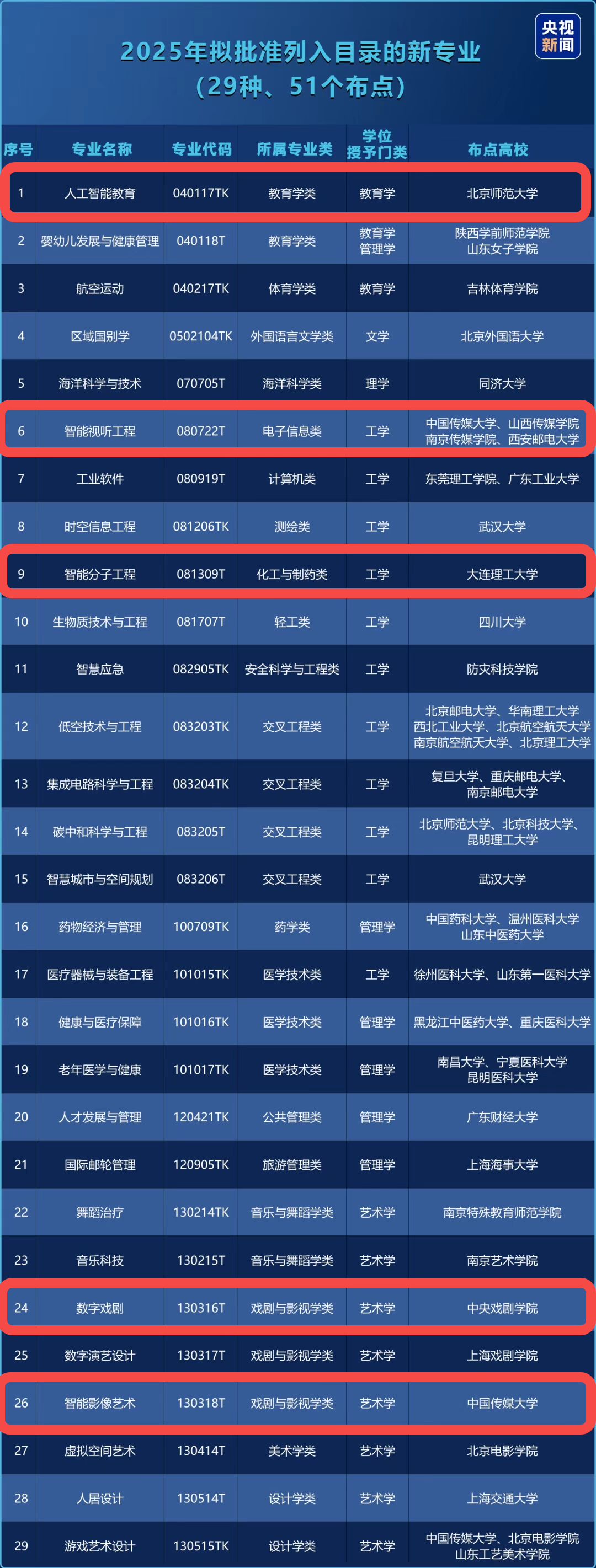 本次调整共增设人工智能教育、智能视听工程、智能分子工程、数字戏剧、智能影像技术等专业。