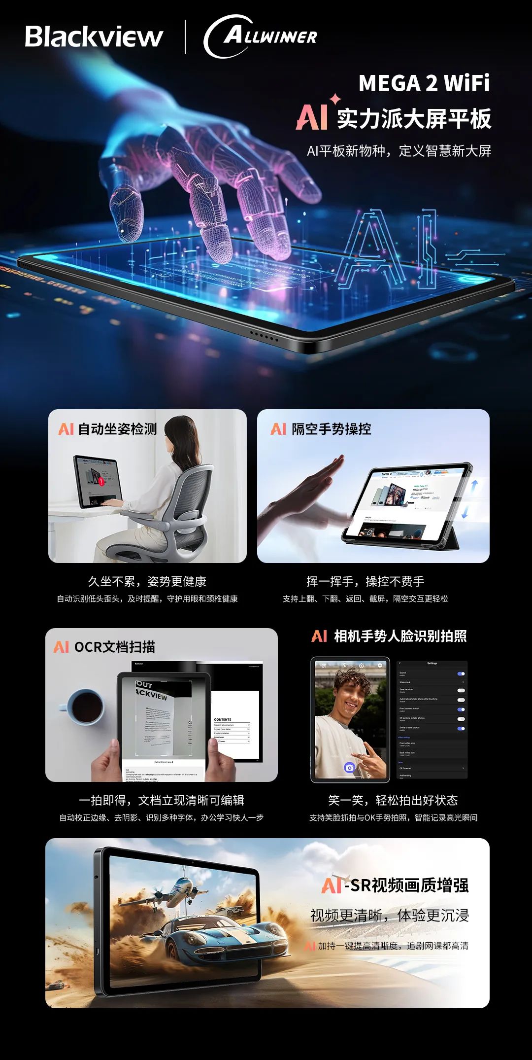 在AI技术持续渗透消费电子终端的大趋势下,平板市场正加速从“工具属性”向“智能伙伴”转型。近日,专注于智能终端研发的创新型科技品牌Blackview携手全志科技,正式推出其旗下首款搭载全志高端AI芯片A733的AI大屏旗舰平板——Blackview MEGA 2 WiFi,为行业注入全新智能动能。作为Blackview首款支持AI隔空手势操控、AI-SR影像超分技术的AI平板,MEGA 2 WiFi通过软硬件深度协同,实现AI功能的场景化落地。其不仅首次集成AI隔空手势操控、AI手势人脸识别拍照、AI自动坐姿检测、AI OCR文档扫描等创新AI功能,还支持Blackview自研Doke AI,实现学习、办公、娱乐等多场景的智慧进化,全面刷新用户交互体验。从交互方式到内容识别,从智能操作到影音提升,MEGA 2 WiFi以AI重塑平板价值边界,标志着Blackview正式引领平板进入“智能2.0时代”,打造真正贴近用户所需的智慧大屏新物种。Blackview CEO 胥明表示:“我们与全志科技的深度合作,是Blackview推进AI终端战略的重要一环。我们希望通过AI技术普惠,让每一位用户都能感受到技术带来的便捷与温度。这不仅是一次技术升级,更是一次品牌使命的实践。”全志科技:AI芯片赋能,打造AI功能“硬实力”基座作为此次联合创新的重要技术引擎,全志高端AI A733芯片为Blackview MEGA 2 WiFi注入强大AI算力。其八核架构(2xA76 + 6xA55)主频高达2.0GHz,搭配3TOPS算力独立NPU,形成GPU、NPU与MCU协同运算架构,在性能与能效之间达成绝佳平衡。同时,支持LPDDR5内存与UFS大内存高速存储,并通过Android 15 GMS认证,为AI功能流畅运行提供坚实基础。在AI能力方面,全志A733不仅实现了视频与图像的AI-SR超分辨率重建和AI-ISP暗光图像增强,还支持18种高精度隔空手势识别,远距操控更自然;其OCR文字识别技术可处理多语种、多字体,重塑学习与办公场景效率。此外,芯片还广泛支持人脸检测、图像分割、人像虚化、宠物与人车识别等AI视觉技术,全面覆盖教育、娱乐、安防等多元场景,加速推动AI从“应用级”走向“系统级”落地。全新AI“芯”功能,打造“与众不同”的AI智能“芯”体验Blackview MEGA 2 WiFi的AI功能将贴近真实场景的智慧进化。无论是孩子长时间写作业伏案低头,还是上班族久坐伏案办公,姿势不良早已成为影响视力与颈椎健康的隐形杀手。Blackview MEGA 2 WiFi将搭载AI自动坐姿识别功能,可实时感知用户的头部和肩颈位置,智能提醒纠正不良坐姿,帮助青少年养成良好平板用眼习惯,也呵护长期办公用户的颈椎健康,真正将AI“健康守护”落到使用每一刻。同时,在厨房做饭双手被占,或上课演示不便触屏操作等场景中,传统平板的交互方式显得尤为受限,MEGA 2 WiFi将通过支持AI隔空手势操控,实现用户仅需抬手轻挥,便可隔空实现翻页、暂停、截图等操作,彻底打破物理接触限制、解放双手,让操作变得优雅高效。无论是居家日常还是商务演示,都能体验到前所未有的“无触即控”智能便捷。面对工作学习中频繁接触的纸质资料、课堂板书、合同文件等内容人工录入耗时且容易出错的场景,MEGA 2 WiFi通过内置AI OCR文档扫描功能,结合AI算法一拍即扫,可以迅速识别并提取文字信息,自动转换为可编辑文本,实现高效知识整理与资料录入,省时省力,大幅提升工作与学习效率。针对用户拍照过程中常常遇到人物姿态难以把握、手动拍摄不便等问题,尤其是更为明显的自拍、远景合影场景,MEGA 2 WiFi将支持AI相机手势人脸识别拍照功能,无需点击快门,只需一个隔空“OK”手势或自然一笑,即可自动启动智能倒计时拍照,轻松定格精彩瞬间,真正做到“有手势就有快门”。通过该功能,无论是家人聚会、亲子互动还是独自拍摄,都能实现释放双手、远距离操控和智能识别,让拍照更轻松、更自然。让每一次影像记录都变得省心又有趣。此外,在观影与在线视频中,针对视频清晰度常因网速、原画质受限而下降,影响观看体验场景,MEGA 2 WiFi将通过AI-SR视频画质增强功能,基于AI智能算法自动提升画面清晰度与细节还原,使模糊画质视频焕然一新,让每一帧画面更清晰细腻,带来超越预期的沉浸式更高清的大屏观影视听体验。真正将AI从“新鲜感”变为“实用性”,让平板娱乐不止于智能,更成日常生活中不可或缺的贴心伙伴。总的来说,Blackview与全志科技的深度合作,为AI平板树立了以场景为本、技术赋能的全新范式,推动平板行业加速迈入智能化2.0时代。全新AI系统进阶:DokeOS 4.2,全新DokeAI引领AI OS体验全面跃迁系统方面,MEGA 2 WiFi首发搭载Blackview自研的DokeOS 4.1系统,全面释放大屏潜能。系统不仅支持键盘、鼠标接入与PC模式2.0,实现多任务窗口分屏操作的高效体验,还融入如人脸解锁、双击亮屏等更符合直觉的智能操作方式,进一步提升日常使用的便捷感与科技感。值得期待的是,系统近期还将通过OTA持续进化,升级至全新DokeOS 4.2,进一步引入Doke AI、AI艺术锁屏、游戏中心、搜索中心、自研浏览器、云文件夹等多项自研创新功能,不断拓展平板的AI边界,真正打造一个更懂用户、更高效也更有趣的AI智慧生活操作系统。Blackview MEGA 2 WiFi的正式发布,标志着Blackview在AI智能领域取得了重要的突破,也开启了Blackview平板电脑的“芯”纪元!全志科技也将持续为合作伙伴提供高性能端侧AI算力,持续创新,和Blackview 一道继续为广大用户带来更AI智能、更便捷、更美好的科技产品!关于多科电子和Blackview