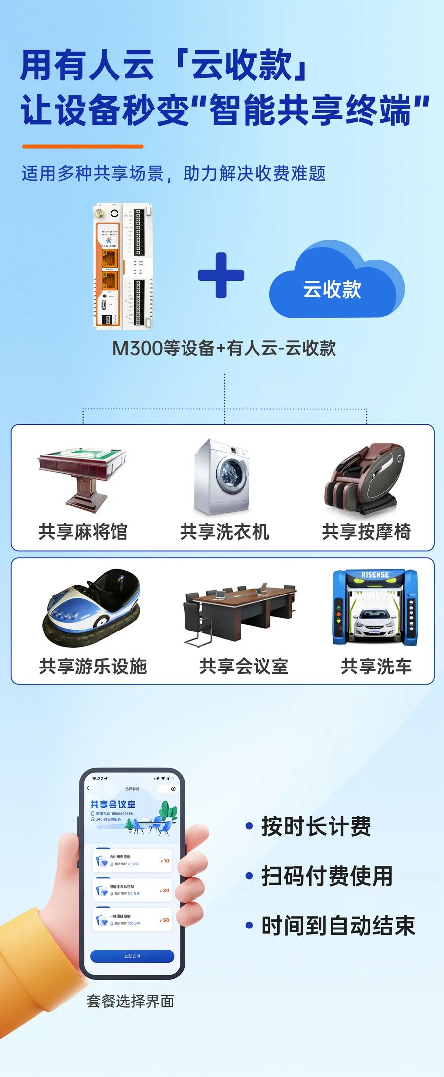 更多场景等你解锁:充电桩/健身舱/台球室......只要是需要终端用户按时长付款的场景都可满足!!