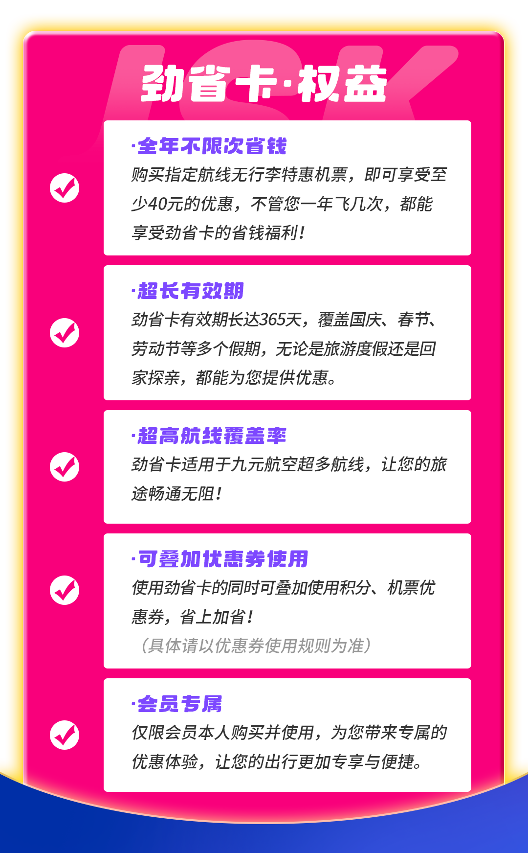 (2)劲省卡产品购买成功后,系统将自动发放劲省卡权益用户可登录“九元航空”微信小程序的会员个人账户中查收。