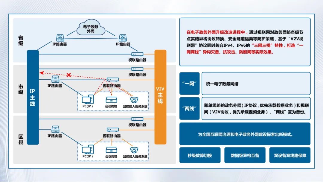 低成本升级现有网络: 视联网的电子政务外网“一网两线三栈”方案展现出了显著的成本优势。该方案基于视联网兼容V2V、IPv4和IPv6协议的特性,在保留原有电子政务外网的基础设施前提下构建视联网,二者互为备份,不仅提高了网络的可靠性和稳定性,还避免了重复建设带来的高额成本投入,实现了网络升级的经济转型。