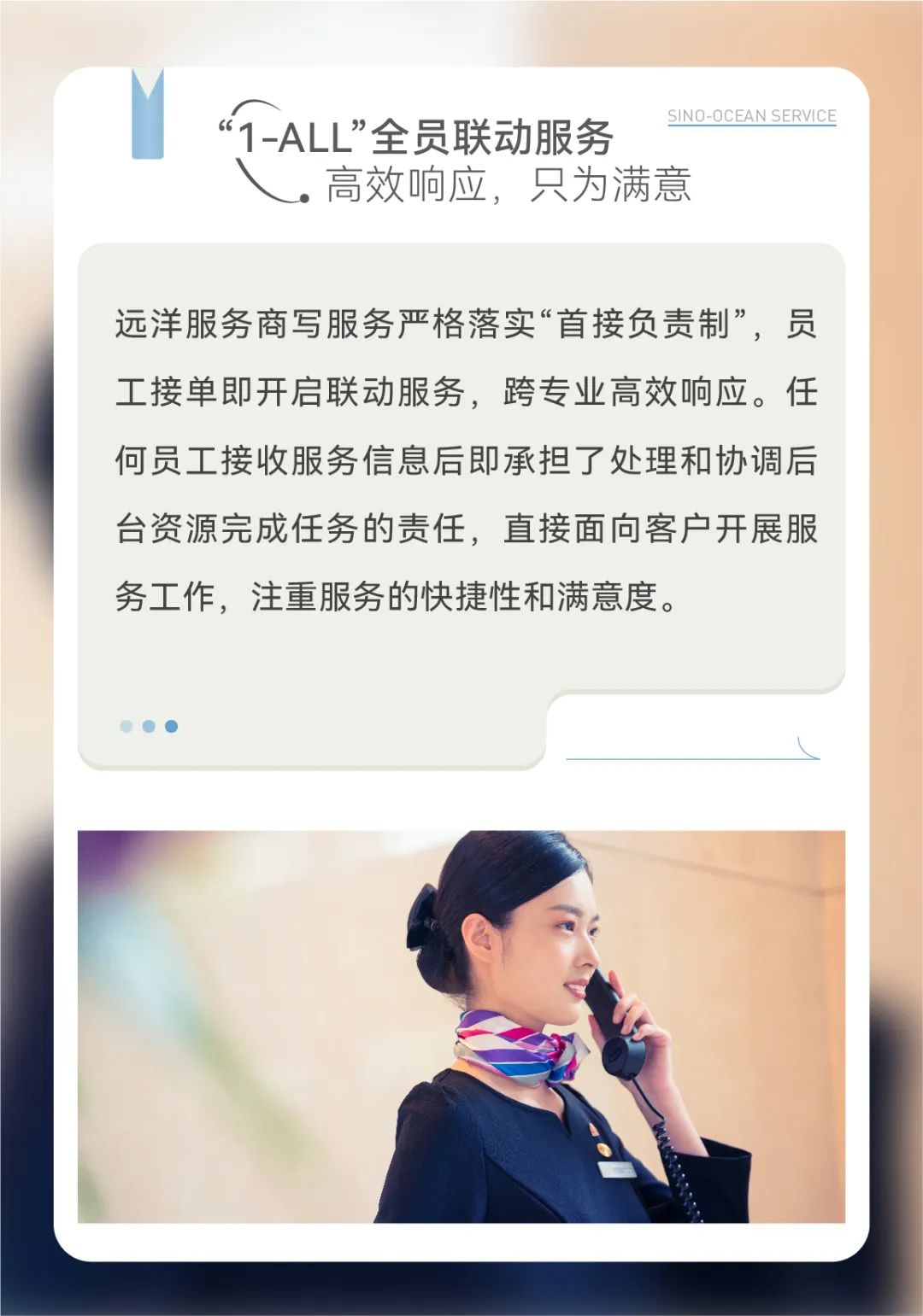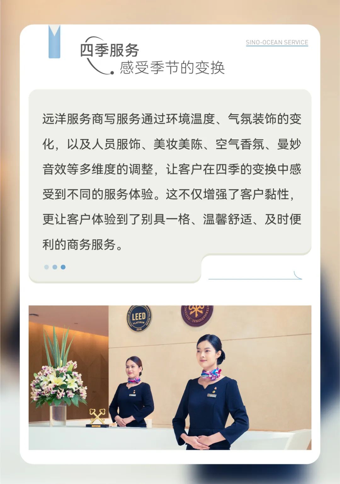 通过精致卓越的高端写字楼服务,为客户带来高效、贴心服务。远洋服务商写业务打造四季服务、楼宇100米、“1-ALL”全员联动等特色服务内容。