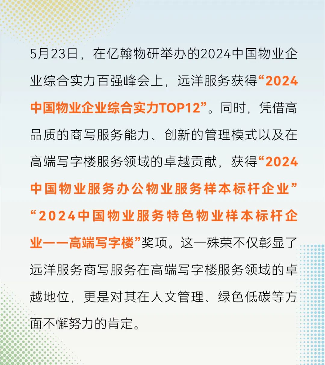 以卓越的服务品质和专业的服务赢得市场的认可,以其对绿色低碳的执着追求和不懈努力,为行业的可持续发展树立了标杆。未来,远洋服务将继续在求“新”求“能”中抓住新机遇、开创新局面,为企业发展注入更多澎湃动能与不竭动力。