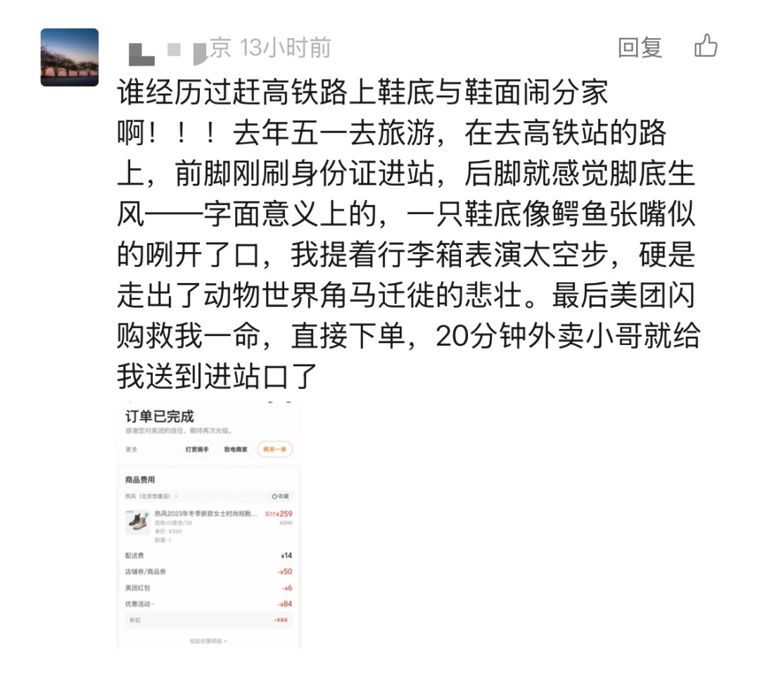 第1321条晒单,闪购了一份“安全感”。无论是脱胶的鞋,还是突然断裂的旅行袋,一单闪购,总能把生活缝隙填满。