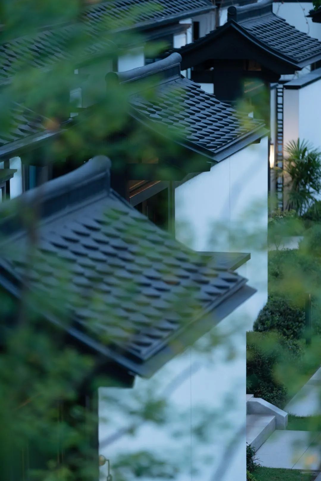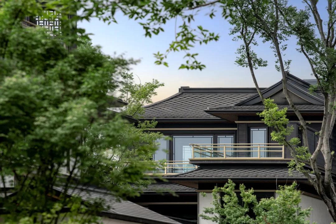 项目屋顶设计将庑殿顶的「四坡顶」与「歇山顶」形式相融合,暗藏「天圆地方」的宇宙观;歇山顶的坡度,暗合宋式「举折之制」;独特的鱼鳞瓦不仅颜值出众,更具自洁、消音、坚固耐用等实用功能。