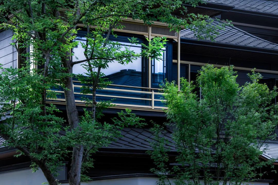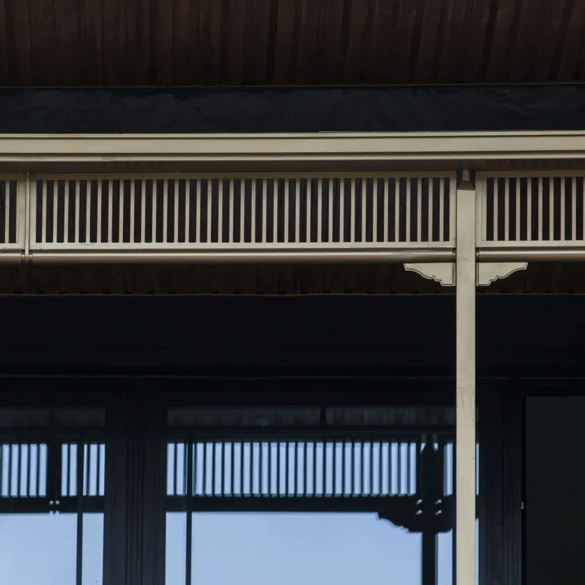 闪烁在横杆寻杖、山墙面格栅及多处建筑细节部件中的「雅颂金」,是项目专属的定制色彩,视觉效果富丽而不炫目,是由多种涂料按不同比例混合,而后尝试加入珠光,再经不同光线下色泽与质感的22轮比对而来,与黛青瓦片、黑色墙面形成和谐的韵律……
