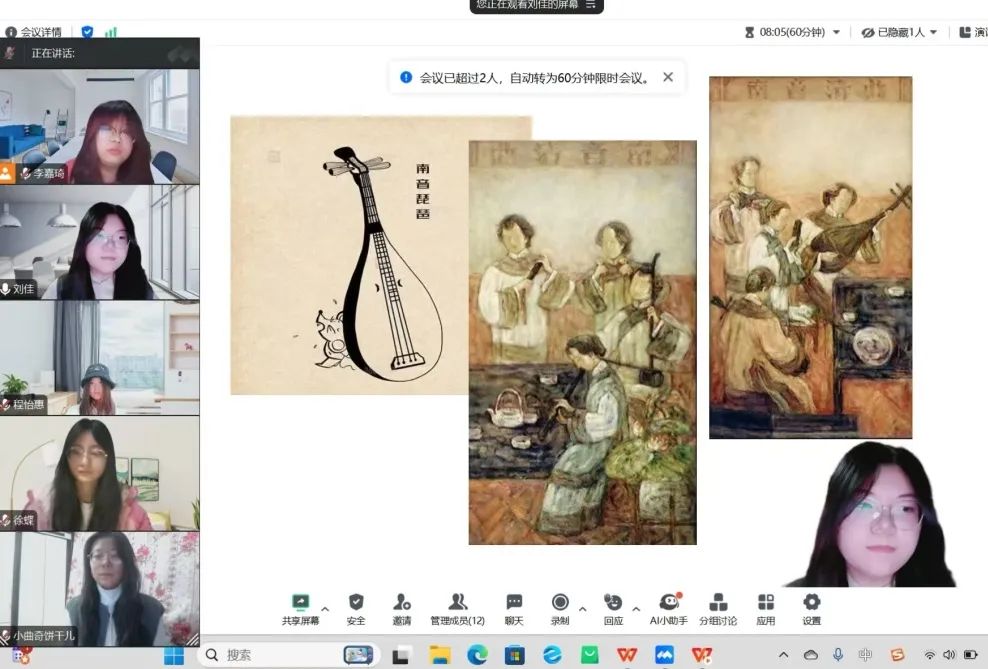 分享开始,刘佳同学向我们介绍了南音的由来。南音起源于晋唐、形成于宋,明代形成完整的演唱体系,并开始向外传播。随着闽南商人与移民,流传至台湾、香港以及东南亚等地。有文化传承、艺术价值、民族认同和教化作用多重意义。南音又称“泉州南音”“泉州弦管”,是保存在福建东南沿海的古老音乐传承晋唐音乐历史信息,积淀历代音乐文化特征,是活的中国音乐史,被称为“中国音乐史上的活化石”。