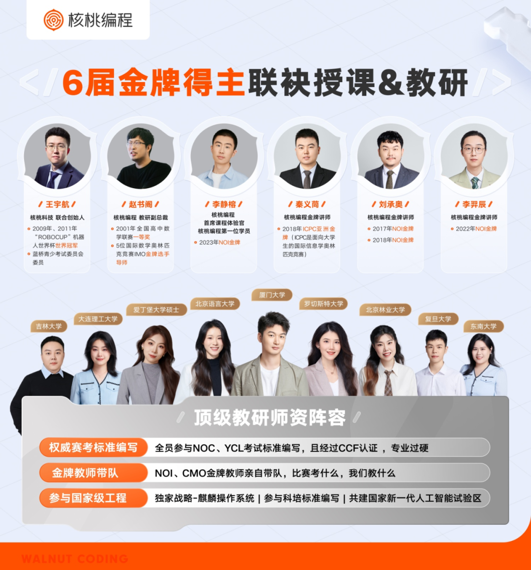 在核桃的教学体系中,PTA教师们将投入深厚的学术功底,以及丰富的竞赛经验到编程教研教学中,精准洞察学生在学习过程中的问题,及时有效为孩子编程技术指导。