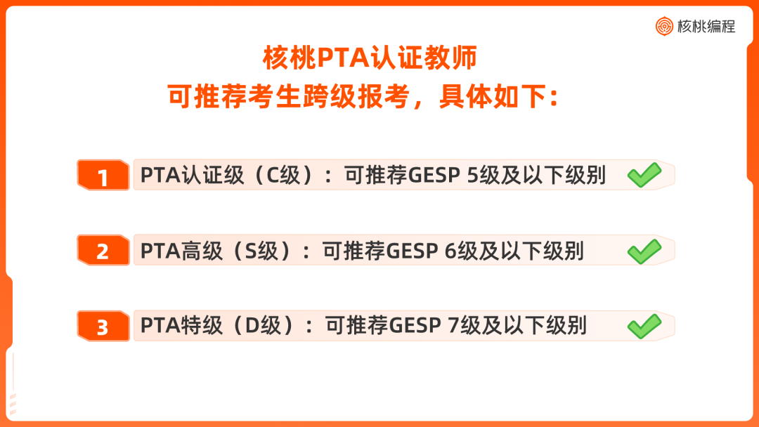 获得PTA认证的核桃教师,每位都手握10个GESP6级推荐名额。可直接推荐学员参加更高级别的等级考试!