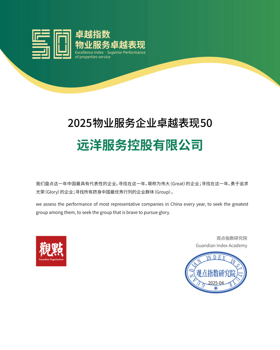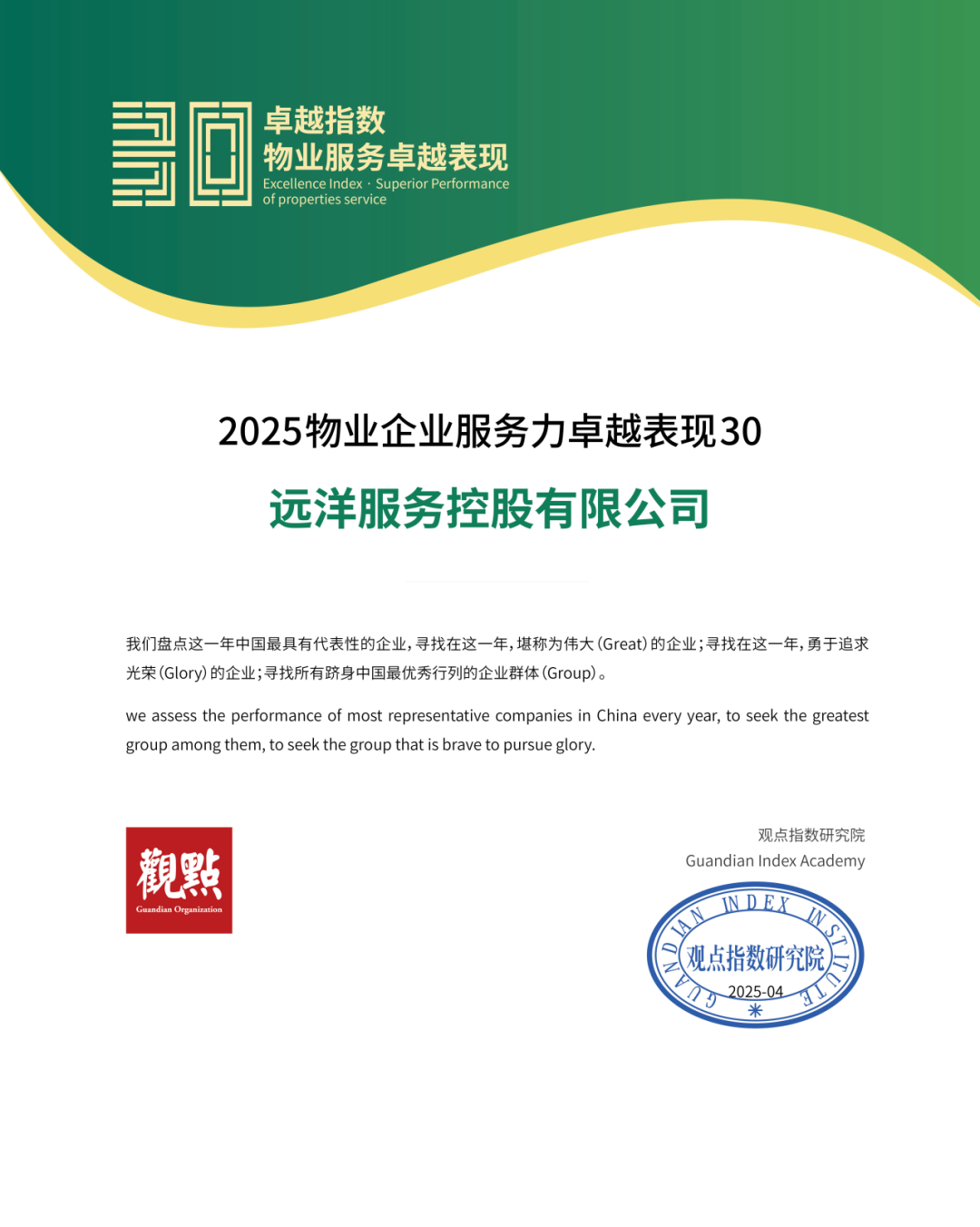 凭借在服务品质上的深耕,远洋服务在观点2025物业服务表现评选中,获评“2025物业企业服务力卓越表现”奖。