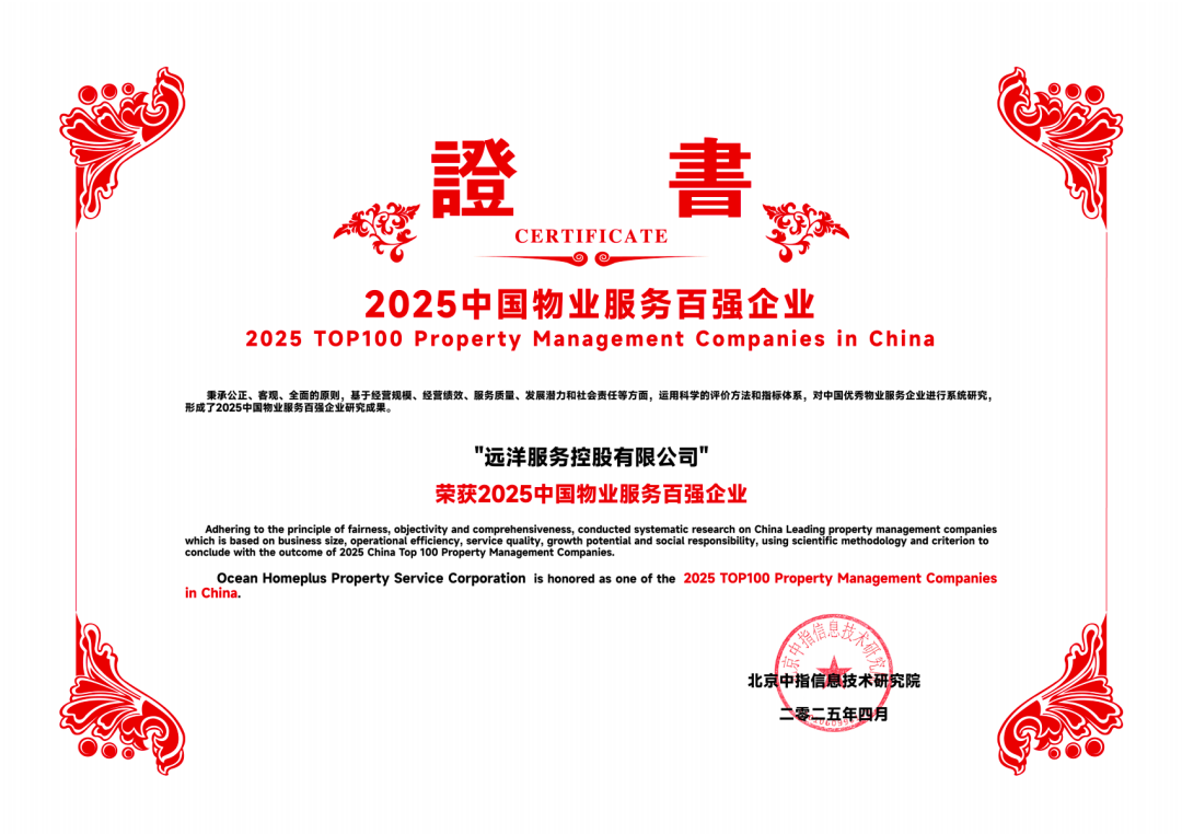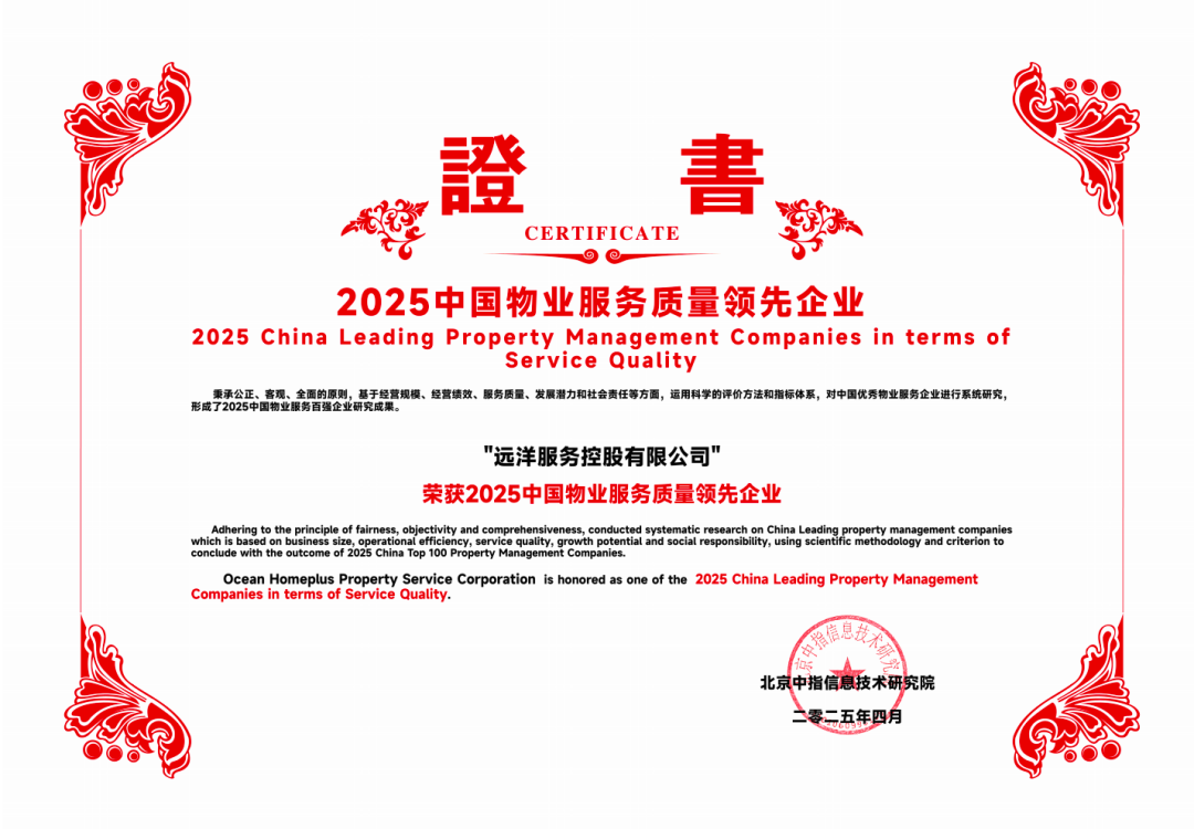 远洋服务凭借稳健可持续经营,获评“2025中国物业服务百强第十二位”,并获得“2025中国物业服务质量领先企业”。