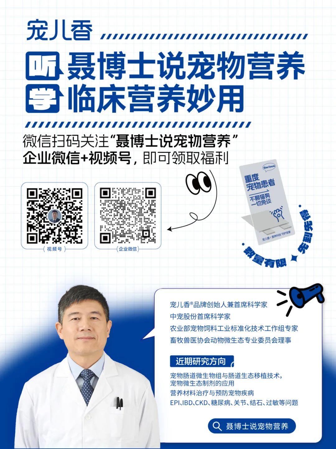 欢迎大家扫码关注,与聂博士相互交流、探讨宠物营养理念,为宠物带去更全面的营养健康保障。
