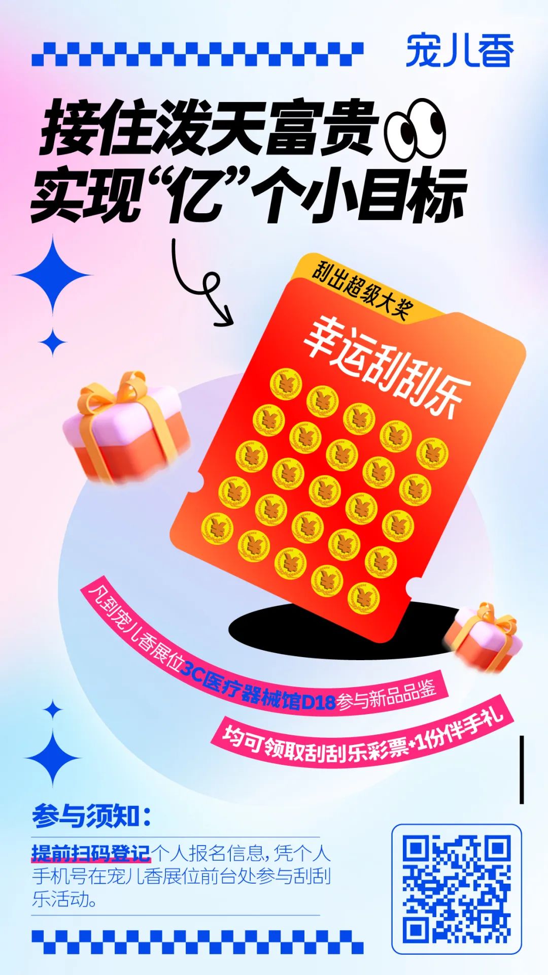 领取须知:参与活动的用户需提前扫码登记个人报名信息,扫码关注指定账号,凭个人手机号在宠儿香展位前台处进行签到,即可参与刮奖活动。