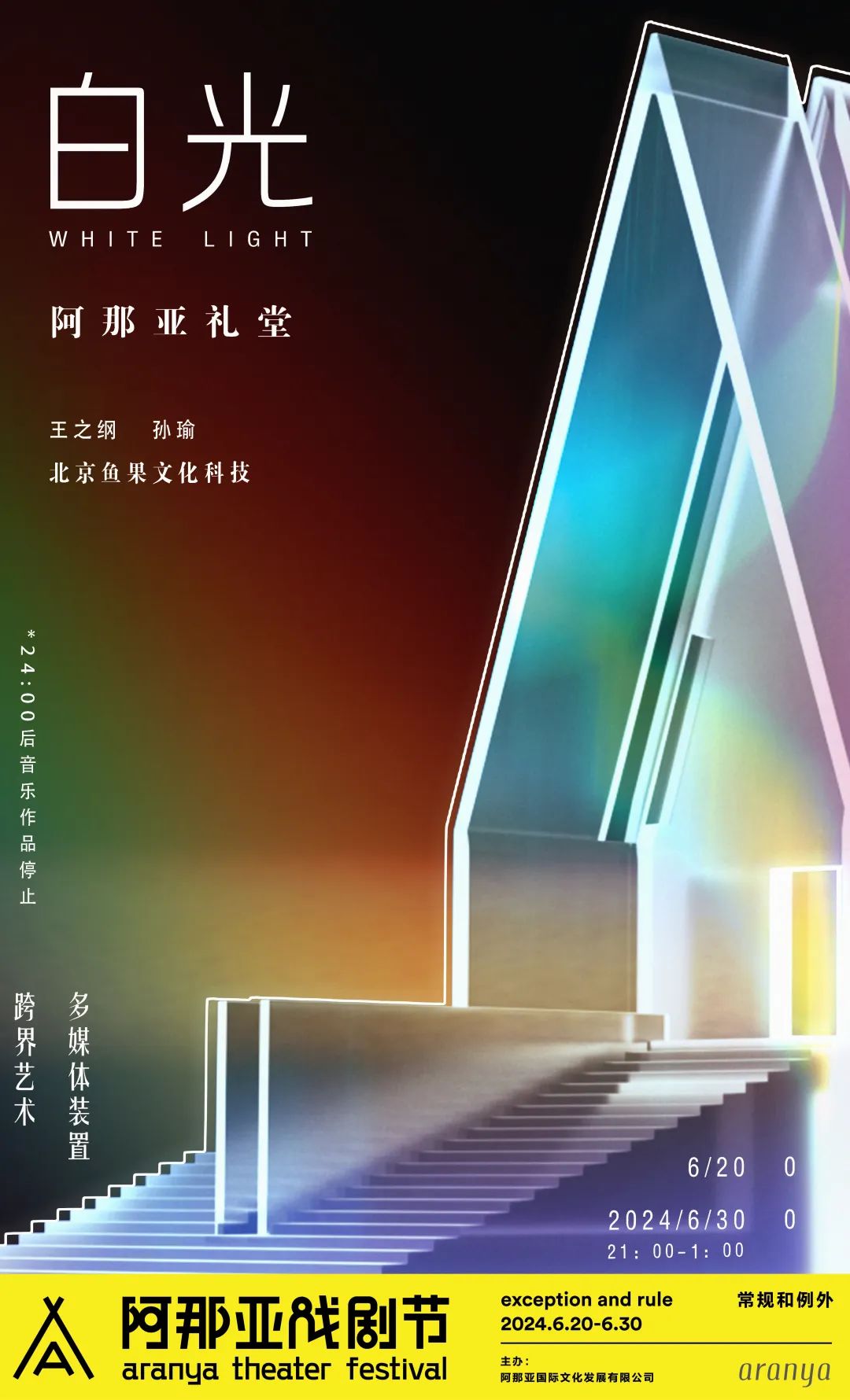 2024年戏剧节期间,艺术家王之纲、孙瑜将携北京鱼果文化科技团队,以阿那亚海边礼堂为载体,呈现多媒体装置作品《白光》(White Light)。