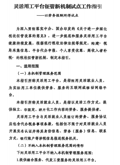 近日,国家税务总局一纸《灵活用工平台征管新机制试点工作指引》刷屏财税圈!这不仅是国家首次以全国统一口径为灵活用工“立标准”,更释放了三大核弹级信号:✅ 个人月入10万免增值税→灵活就业迎来“免税红利期”✅ 资质合规平台可全国代办税务→灵工服务从“地方游击战”升级为“全国一盘棋”✅ 120万年收入强制转个体户→高收入自由职业者合规化倒计时
